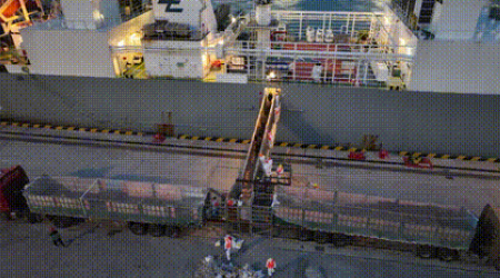 在山東港口青島港前灣集裝箱碼頭,3000余頭活牛卸船轉(zhuǎn)運(yùn)。開辟貴賓“牛牛牛”專用通道,針對活牛接卸特點(diǎn)為客戶“量身定制”活牛海運(yùn)卸船專屬作業(yè)方案,采用“車船直取”作業(yè)模式,在碼頭前沿設(shè)置隔離區(qū)域配套設(shè)計(jì)專門的卸牛平臺。采取全封閉管理模式等措施,高標(biāo)準(zhǔn)做好活牛卸船裝車疏港等環(huán)節(jié)的銜接順暢,助推進(jìn)口活牛順利完成卸船作業(yè)。