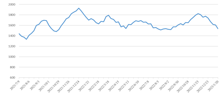 東北區(qū)域:春節(jié)前最后一周基本已提前放假貨源已基本停發(fā),市場運量持續(xù)下降。本期東北指數(shù)報收1448點,環(huán)比下跌144點,跌幅9.05%,其中東北至華南指數(shù)報收1329點,環(huán)比持平。