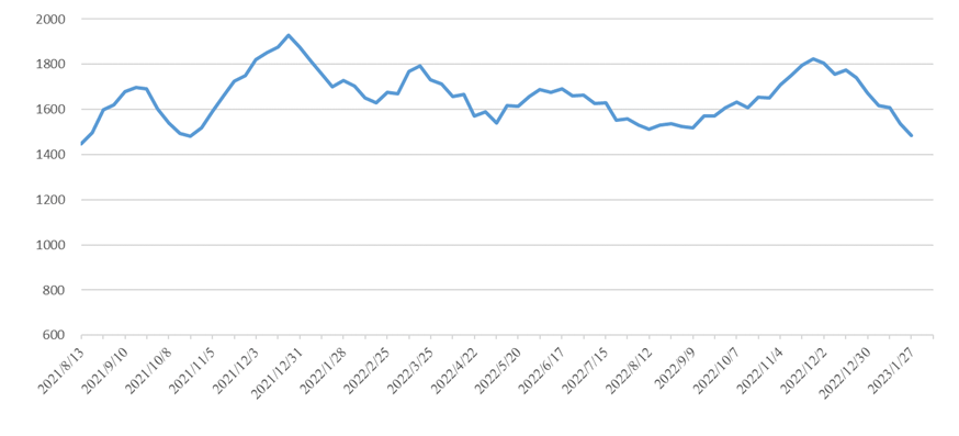 華北區(qū)域:春節(jié)假期及寒潮影響,市場運(yùn)量保持低位以存貨為主。本期華北指數(shù)報收1221點,環(huán)比下跌111點,跌幅8.33%,其中華北至華南指數(shù)報收1222點,環(huán)比下跌141點,跌幅10.34%。